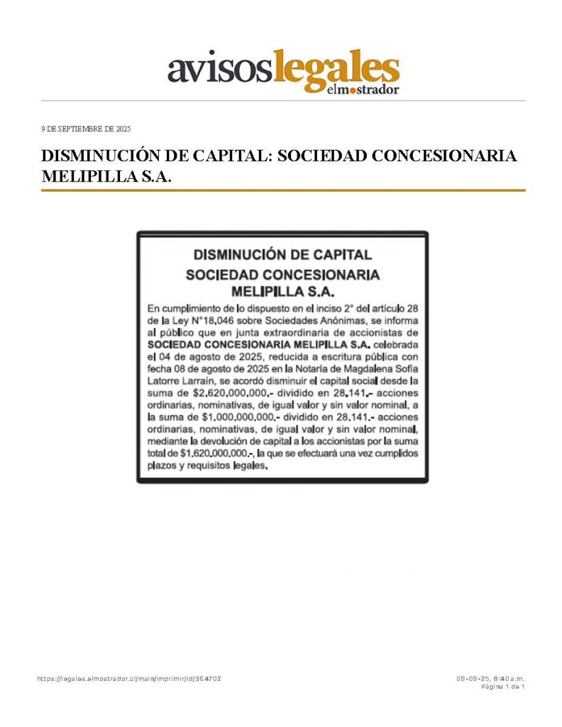 En cumplimiento de lo dispuesto en el inciso 2° del artículo 28 de la Ley N°18,046 sobre Sociedades Anónimas, se informa al público que en junta extraordinaria de accionistas de SOCIEDAD CONCESIONARIA MELIPILLA S.A. celebrada el 04 de agosto de 2025, reducida a escritura pública con fecha 08 de agosto de 2025 en la Notaría […]